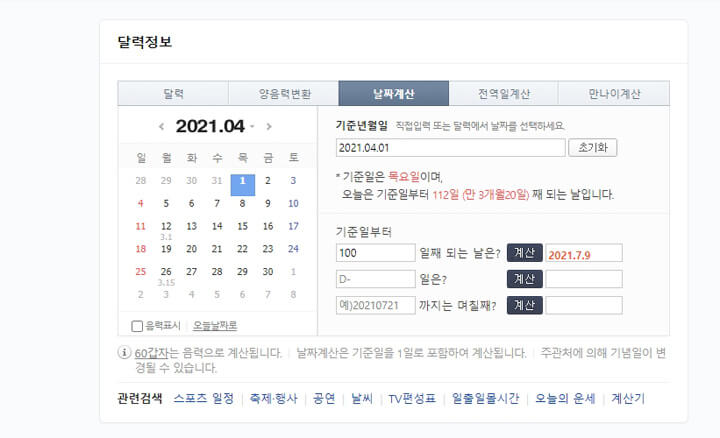 기준일로부터 100일째 되는 날은?이라고 설정하고 계산 버튼을 누르면 오른쪽에 계산된 일자를 표시해줍니다.